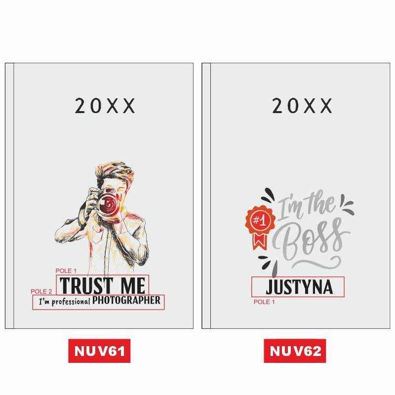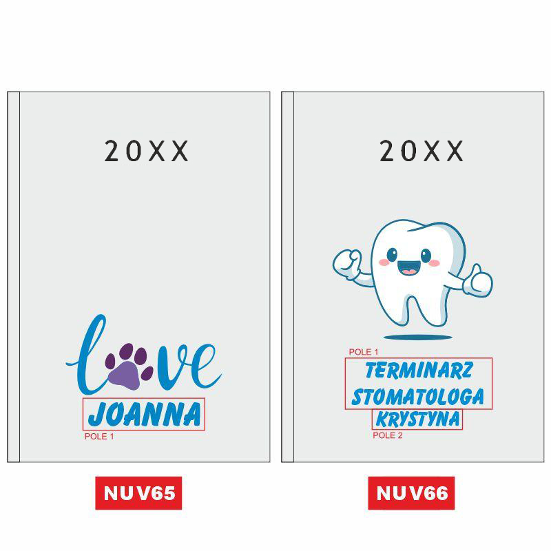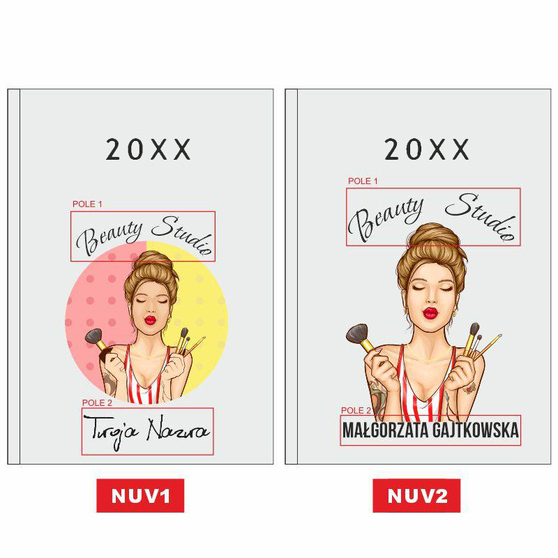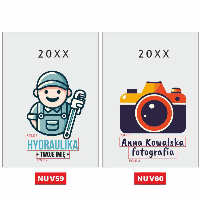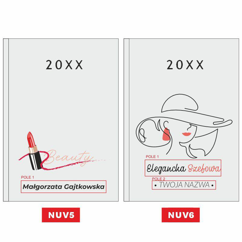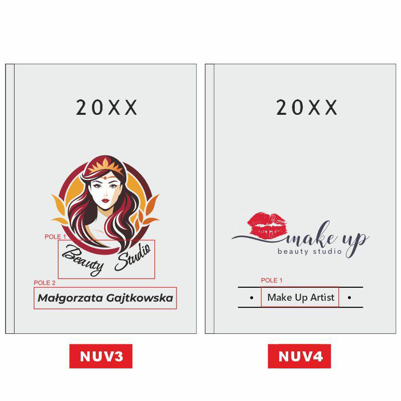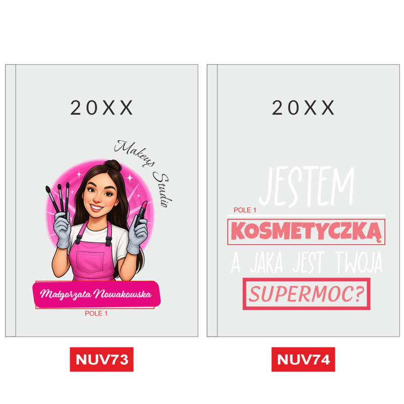Nasz kalendarz wyróżnia się na tle innych dzięki zastosowaniu innowacyjnej technologii nadruku UV. W przeciwieństwie do tradycyjnych metod, nadruk ten pozwala na naniesienie na okładkę pełnokolorowych, wyrazistych grafik, takich jak widoczna na zdjęciu ilustracja stylistki z narzędziami. Możliwość personalizacji nadruku o imię i nazwisko (np. „Małgorzata Nowakowska”) oraz nazwę salonu („Nails Studio”) sprawia, że Twój planer staje się unikalną wizytówką Twojej marki, która zachowa intensywność barw przez cały rok.